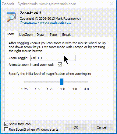 - Zoom (預設組合鍵Ctrl+1):將畫面放大的功能,可以設定放大的動畫秒數,放大後點一下左鍵可以在螢幕繪製。