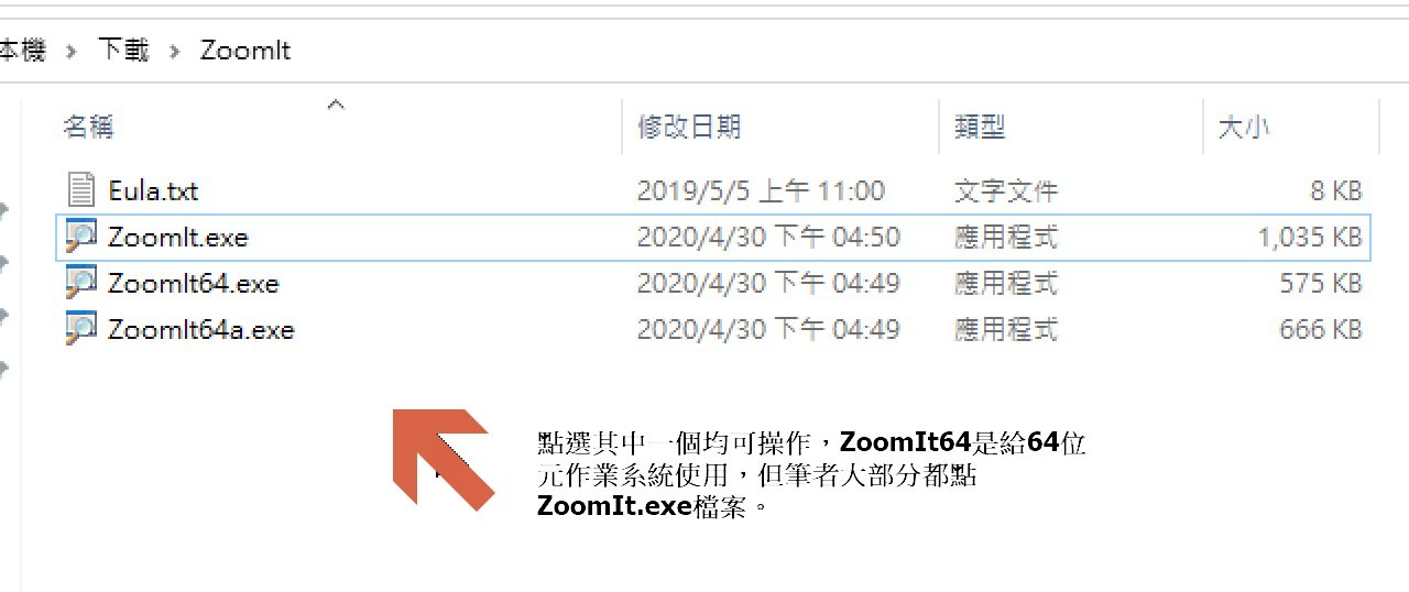 下載完畢,解完壓縮有幾個檔案,原則上選其中一個都可以,我個人常使用的是ZoomIt.exe這個檔案,點兩下就能開啟。