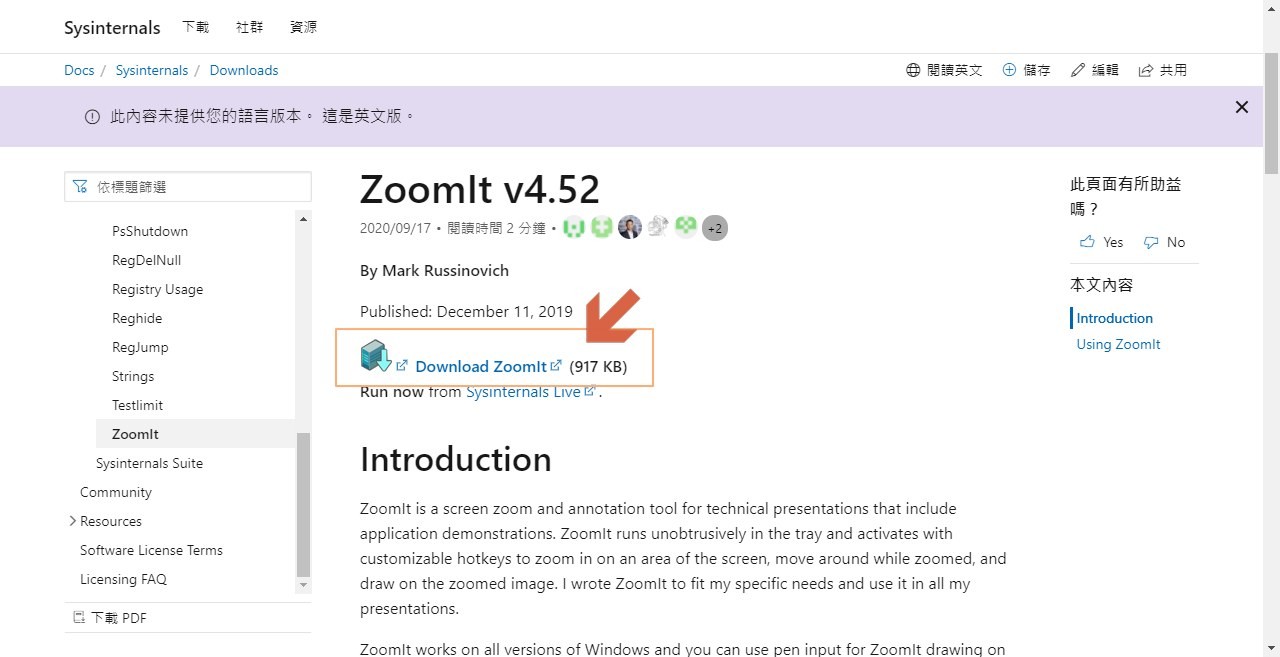 ZoomIt可以到微軟的docs.microsoft.com去下載,請點這邊去下載。